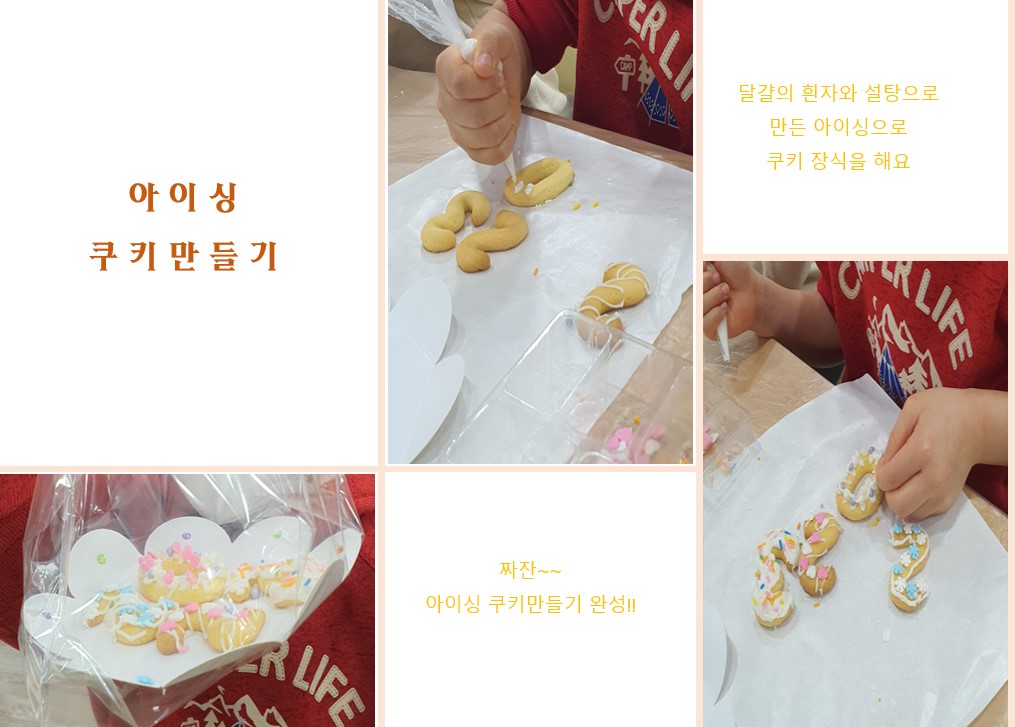 요리 수업은 오감을 자극하는 놀이라서 그런지 우리 꼬맹이가 참 좋아하는 수업입니다. 아이싱쿠키 만들기는 만들어진 쿠키에 아이싱으로 이쁘게 장식을 하는 수업이라서 어렵지 않고 재미있게 할 수 있어 아이의 만족도도 상당히 높았습니다.
