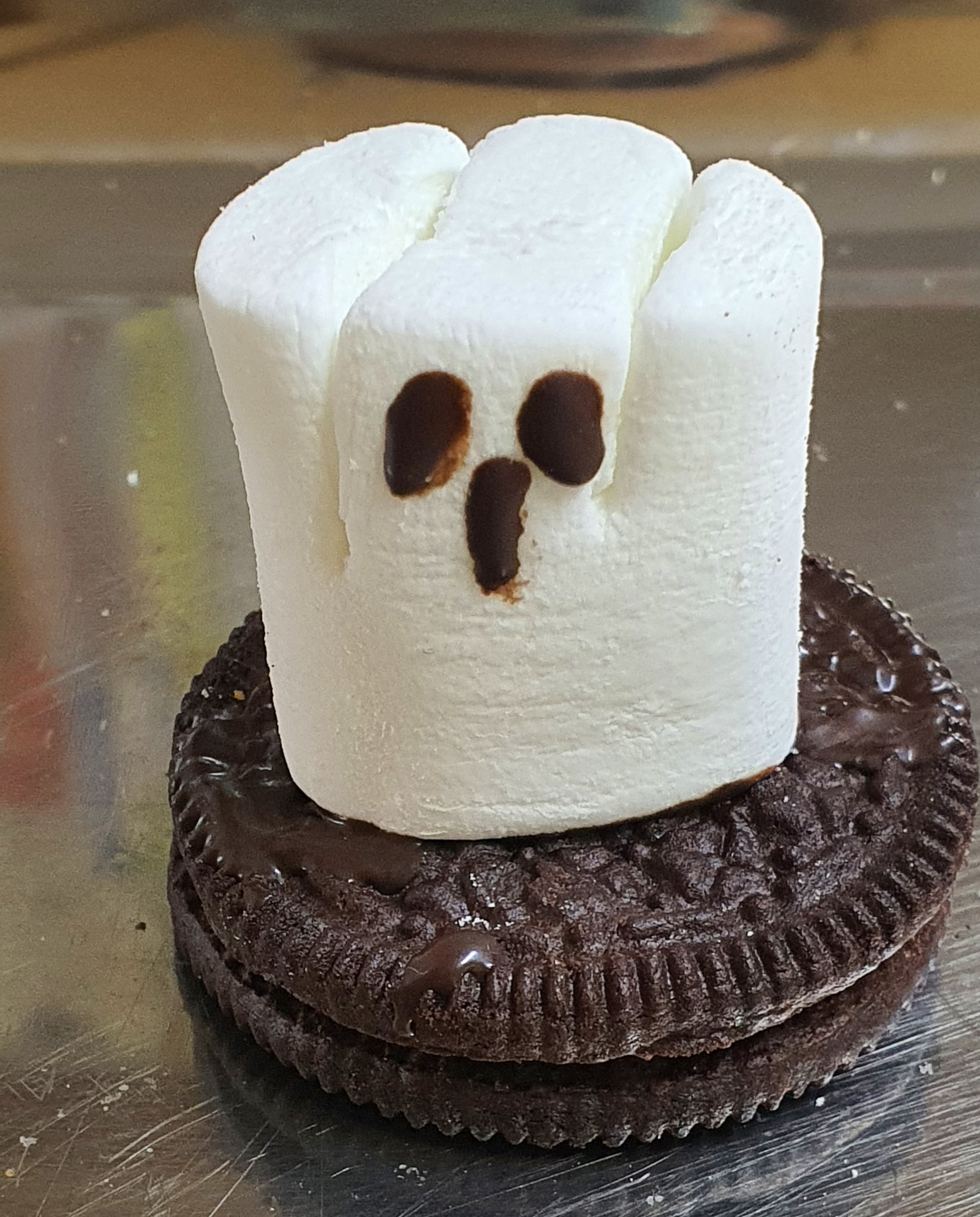 3. 마시멜로 바닥에 초코펜을 살짝 칠해서 초코 과자에 붙여 주세요.