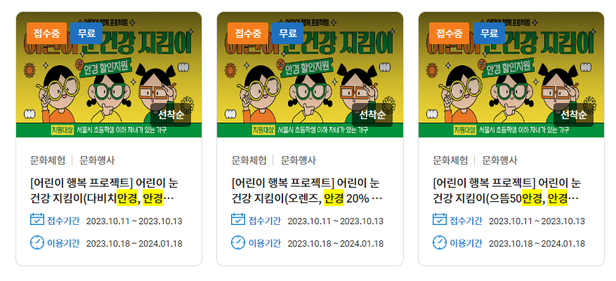 서울시에서는 '어린이 눈건강 지킴이 사업'으로 매달 3천 명에게 안경구입 시 최대 20%까지 할인되는 쿠폰(시력검진 표함)을 제공합니다.