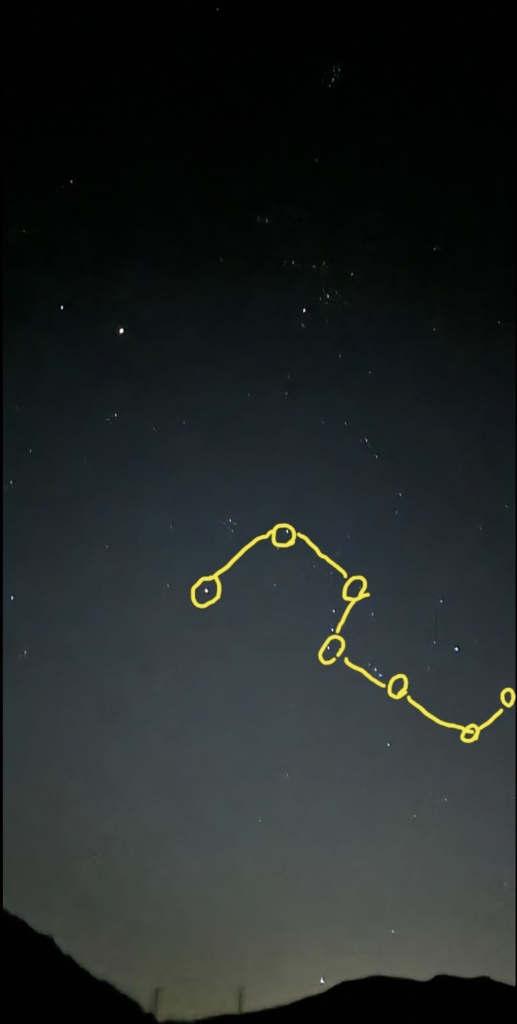 아이가 찍은 사진을 자랑하는데 갑자기 지인이 보내준 북두칠성 사진이 생각이 났어요. 시골에 갔다가 밤하늘이 이뻐서 사진을 찍었는데 북두칠성이 딱 보인다고 사진 위에 그려서 보내줬었는데요, 한참 별에 푹 빠진 아이에게 그 사진을 보여주니 엄청 신기해했습니다. "여기 큰 곰자리도 숨어있으니 한번 찾아볼래" 했더니 신이 나서 어쩔 줄 몰라합니다.